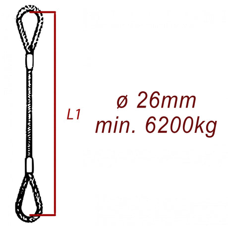 Ocelové vázací lano, oko-oko, průměr 26mm jednopramenné, zalisované, nosnost min 6200kg