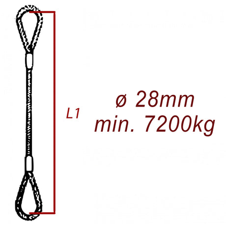 Ocelové vázací lano, oko-oko, průměr 28mm jednopramenné, zalisované, nosnost min 7200kg