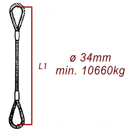 Ocelové vázací lano, oko-oko, průměr 34mm jednopramenné, zalisované, nosnost min 10660kg