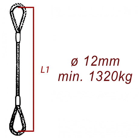 Ocelové vázací lano, oko-oko, průměr 12mm jednopramenné, zalisované, nosnost min 1320kg