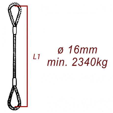 Ocelové vázací lano, oko-oko, průměr 16mm jednopramenné, zalisované, nosnost min 2340kg